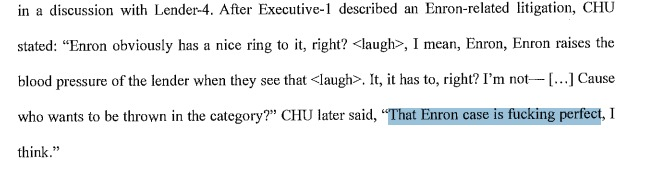After learning that lenders had identified tens of millions of dollars in loans marked current despite months without payment, Chu used profanity to describe the situation, calling it “the stupidest fucking thing” he had heard, and pressed subordinates on why balances had not been reduced to match the altered payment histories. As one lender moved to terminate its facility, Chu discussed bringing up the fate of Enron, which collapsed in 2001 amid one of the biggest corporate scandals in history, in order to pressure banks to settle. He also suggested using artificial intelligence tools to identify language that could raise concerns for lenders about their own exposure.