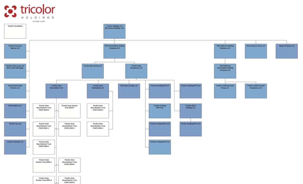 Within that structure, each subsidiary had a specific role: Tricolor Auto Group and Tricolor Real Estate Services handled sales and dealership operations, while Tricolor Auto Acceptance, Tricolor Financial and Apoyo Financial focused on financing and originating loans. Other units provided insurance and tax services, and entities such as Tricolor Auto Receivables and TAG Asset Funding were used to bundle customer loans into securities for investors.