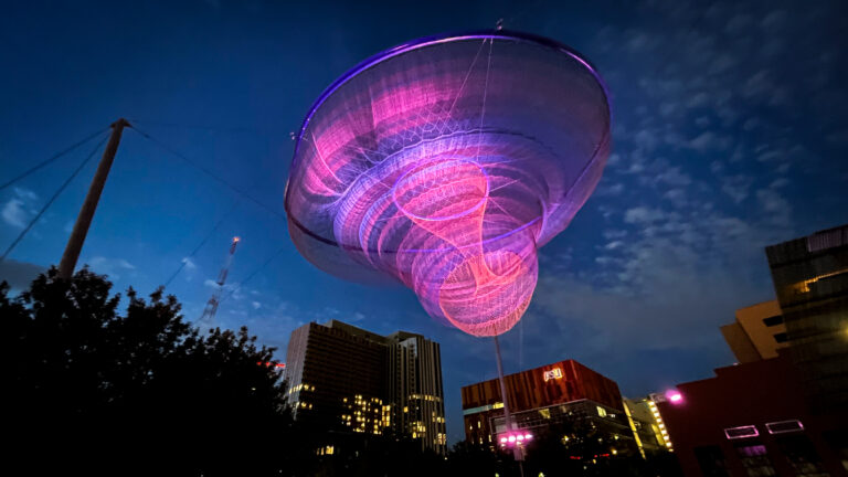 A mural on the side of a new apartment building, a light installation that illuminates a walkway at night, and statues that flank park entrances.